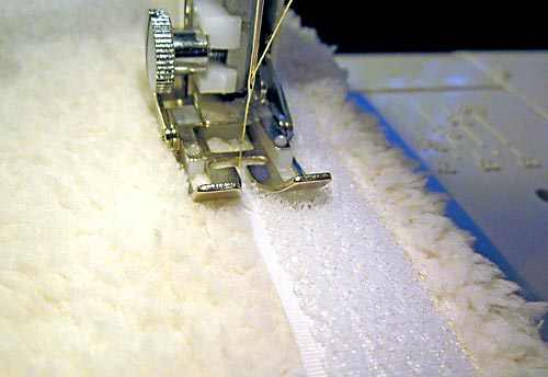 NOTE: When sewing on fleece or bulky fabrics, we like to use a Walking foot (sometimes called an Even Feed foot) to help keep the layers feeding evenly. Another tip when working with two fabrics that are different thicknesses and/or textures: sew with the thicker/slipperier fabric on the bottom and let your machine’s feed dogs help handle the “problem” fabric. For example, we used our Walking foot and sewed with the fleece side down on the one pair and the sherpa side down on the other pair.