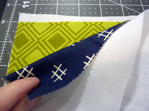 - Layer your scraps as follows on your work surface: muslin, back print fabric right side up, front print fabric right side down, muslin. Your two print fabrics should be right sides together.