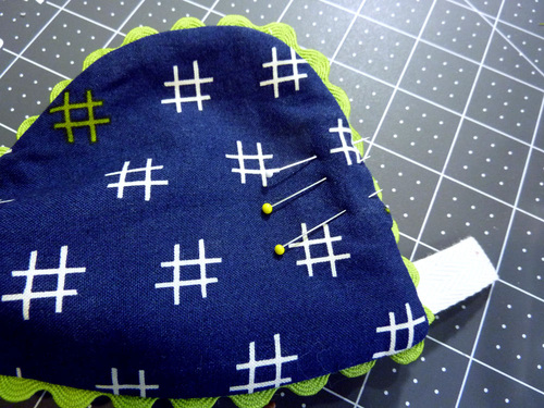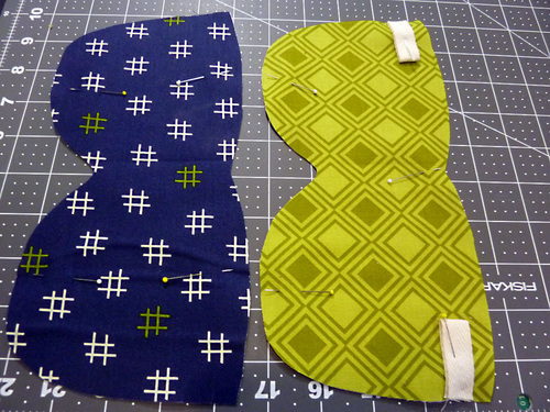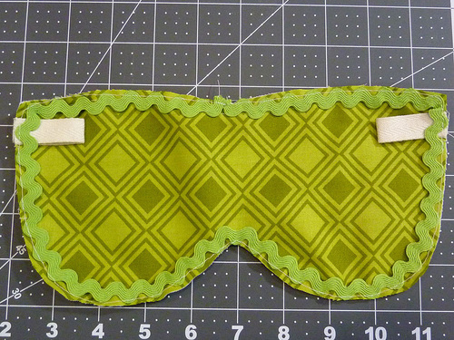 - Fold the twill tape tabs in half so they are now each 3”. Align the raw ends and pin the tabs in place at each side of the back layered pair, using the marking points you made above.