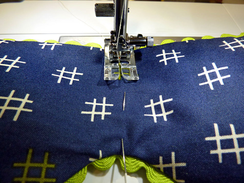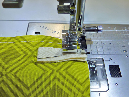 - Using a ¼” seam allowance, stitch around the entire perimeter, remembering to pivot at each upper corner and to lock your seam at either side of the 2” opening.