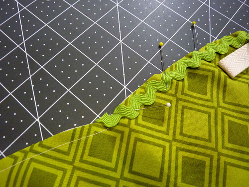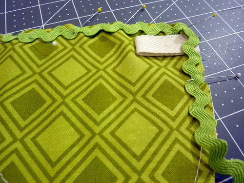 - Place the front and back layered pairs right sides together, aligning all the raw edges and sandwiching the trim and tabs between the layers. Pin in place, leaving a 2″ opening on one side for turning right side out.