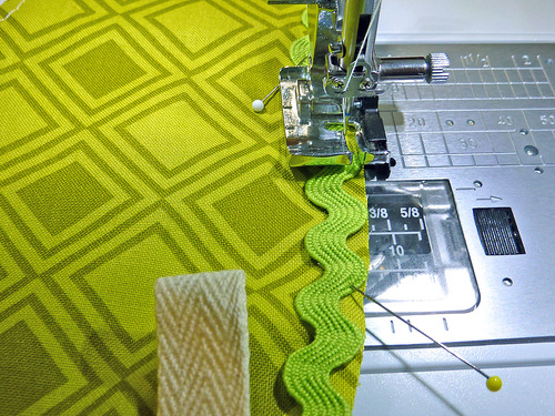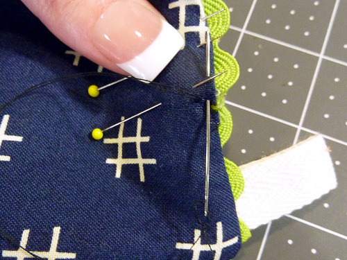 - Baste the trim in place within the ¼” seam allowance – so quite close to the raw edge.
