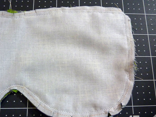 - Using a ¼” seam allowance, baste each front and back layered pair. This basting seam also secures the tabs on the back layered pair.