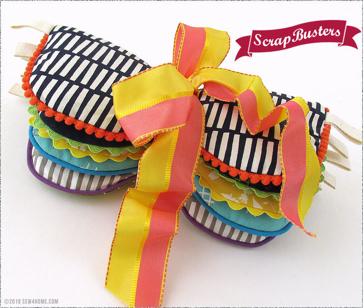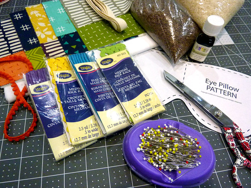 - Scraps of narrow trims in colors to contrast with your main fabric prints – you need about 30” per eye pillow; we used standard packaged piping and rick rack, plus mini pom poms