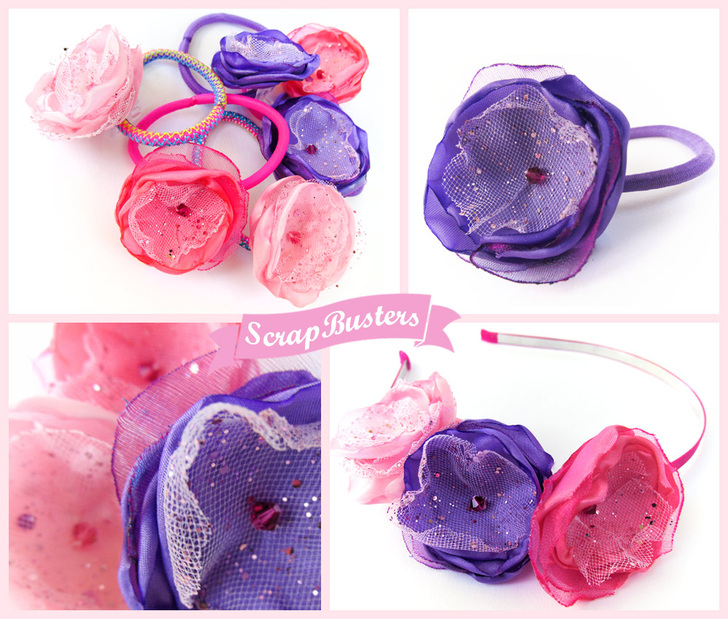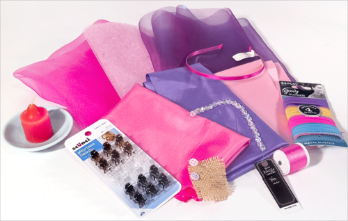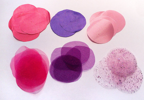 - Scraps of synthetic fabric: we used a glitter tulle in light pink, pink and purple organza, and some scraps of poly lining in light and medium pink and lilac