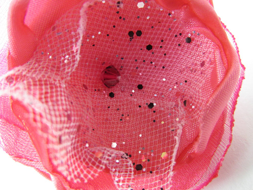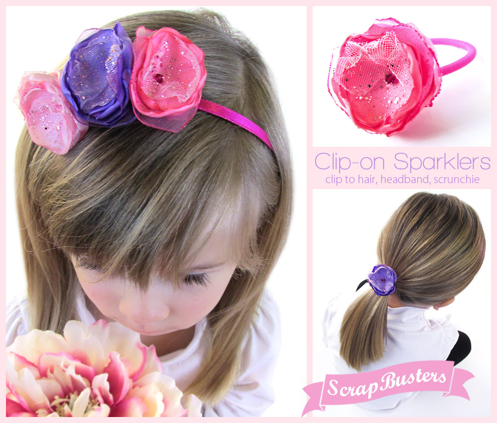 “If your hair is done properly and you have on good shoes, you can get away with anything.” So says Iris Apfel of Harper’s Bazaar. And, I would have to agree. We all know a “good hair day” is simply “a good day!” Our sparkly flower hair clips were designed with little girls in mind, but they can inject a bit of glamour into your lovely locks as well. The “petals” are made from tiny scraps of various synthetic fabrics; we used glitter tulle, organza, and polyester lining fabric. A tiny, faceted bead holds everything together at the center.