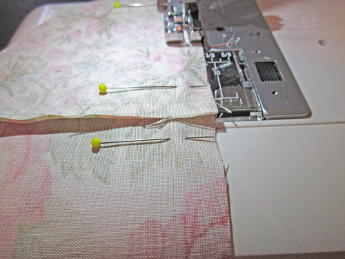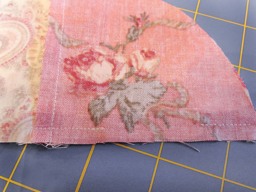 - For each circle, place the top and bottom pairs right sides together, pinning in place along the inside straight edge.