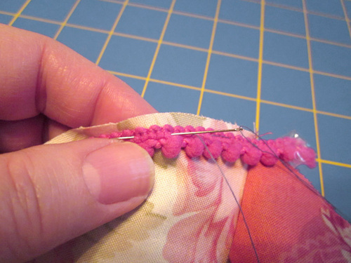 - Thread a hand sewing needle with contrasting thread and hand baste the mini pom trim to the top circle (the circle without the opening in the seam). The poms should sit ¼” from the raw edge of the circle.