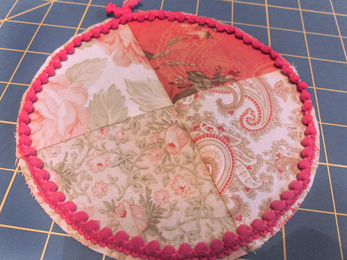 - Trim away the excess trim tails and turn the cushion right side out through the opening in the center seam of the bottom circle. The pom trim should pop out nicely and evenly around the edge. Press flat. Remove any visible hand basting stitches.