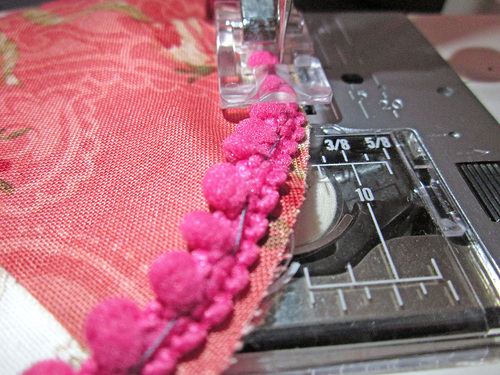 - Following along in the trim’s machine basting seam, stitch the two layers together around the entire perimeter. We used our standard presser foot (the mini pom trim is soft and easy to run the foot over); a Zipper foot would be another option.
