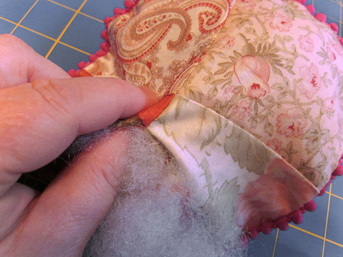 - Working with small handfuls of polyester fiberfill, stuff the cushion through the opening in the back seam. You want it to be pretty firm.
