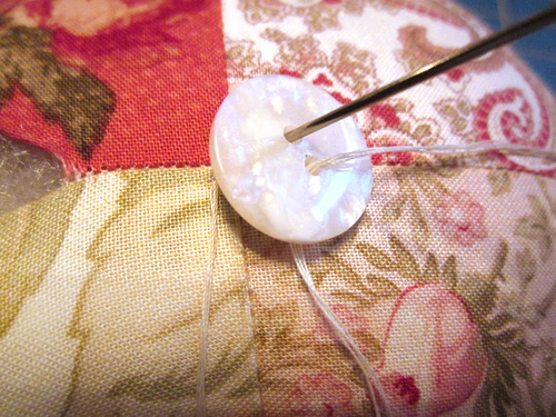- Pull up the thread tightly to create the tufting and secure, but do not cut thread. Slip the needle into the cushion fabric just to hold it in place.