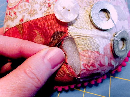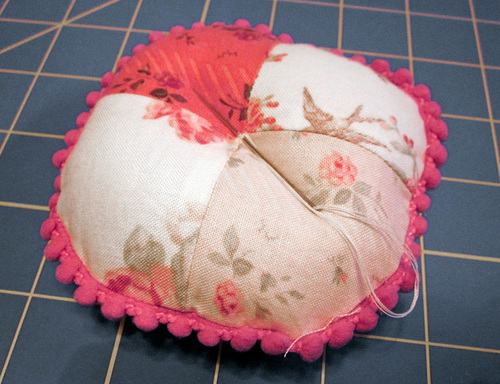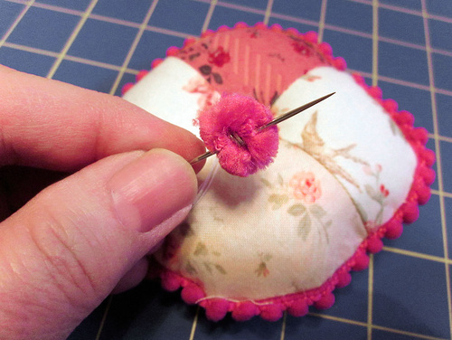 - Take a stitch or two at the center of the pincushion back to secure the thread, making sure to catch only the fabric (not the stuffing).