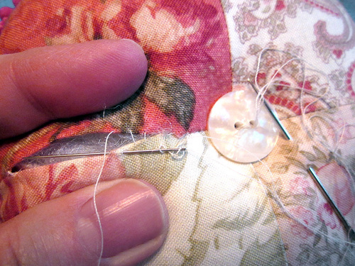 - Thread the needle through one of the decorative buttons. Again, pass the needle back and forth several times from front and back, ending at the back.
