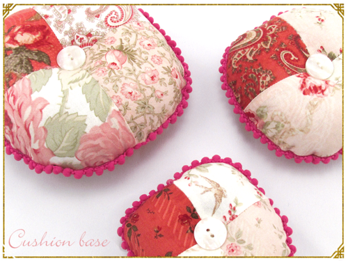 - The 5″ pin cushion is made in exactly the same manner. For the 4″ cushion, simply substitute a single ½” pom for the top button, creating the “cherry on top” of your pin cushion “cake.”