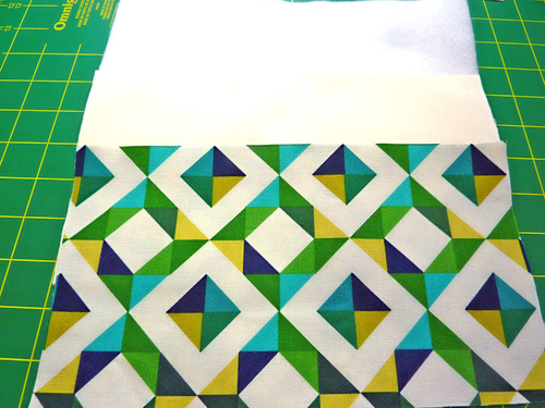 - Find the two exterior panels and the two fusible fleece panels. Place a fleece panel against the wrong side of each exterior panel. All four sides of both layers should be flush. Following manufacturer’s instructions, fuse the fleece in place.