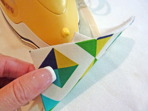 - Our case is designed to have 3” corners. To create this width, cut 1½” squares from each bottom corner of each piece: the two exterior panels (with the fleece fused in place) and the two lining panels.