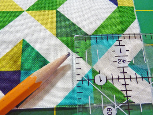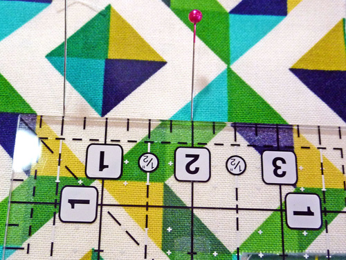 - Using the guidelines on the pattern, mark the position for the label. If you are not using a pattern, measure 1½” down from the top raw edge an 2” in from the right raw edge to find the placement point for the upper right corner of the label.