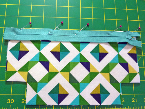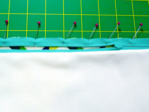 - Center the zipper in place across the top raw edge if the panel. The zipper and the panel are right sides together and the zipper pull is situated to the right. Pin in place across the top through all the layers.