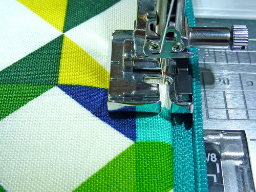 - Stitch in place through all the layers, again using a ¼” seam and moving the zipper pull as described above.