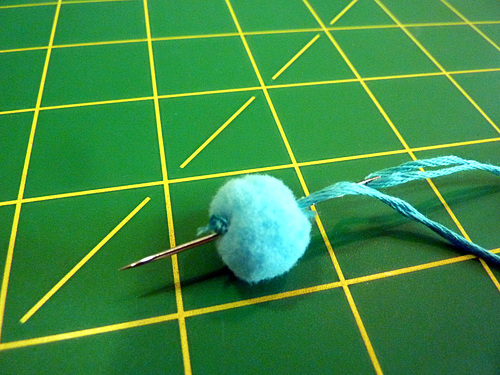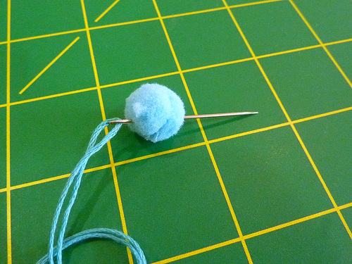 - Embroidery floss in a color to match the zipper and poms – optional; to attach the poms and sew the label in place