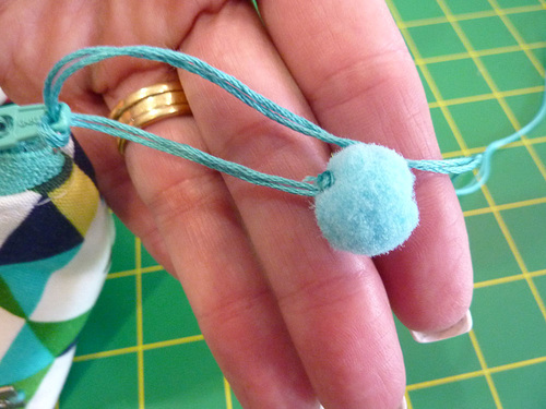 We added a pair of matching poms as a zipper pull on each of the pouches for a fun little bouncy accent. Look for loose poms in your stash or cut from them a scrap of trim. We did both, attaching the poms with a double strand of Aurifil AuriFloss.
