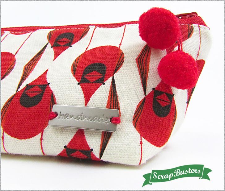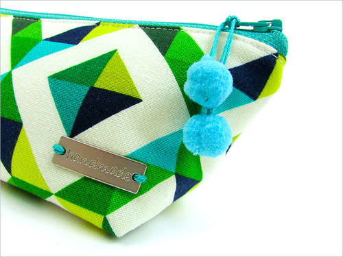 A metal label on the front of each pouch is the finishing touch. These were originally from the Dritz collection of leather and metal labels. We stitched them in place with the same AuriFloss used to attach the poms so it it adds yet another pop of color.