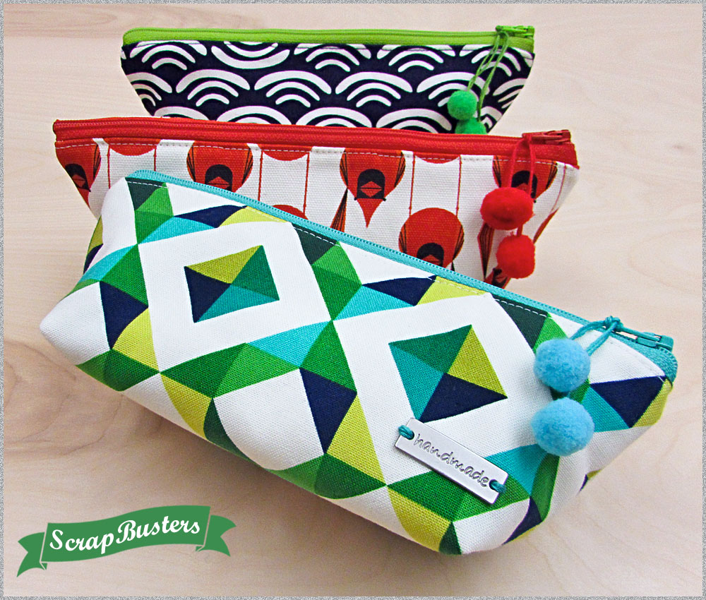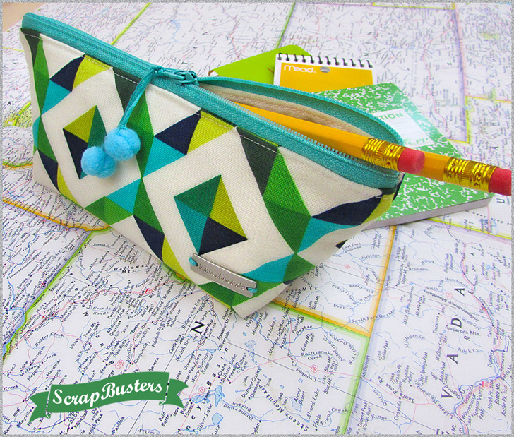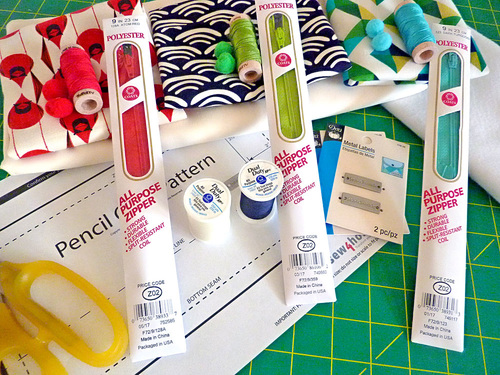 The zippered top opens to a full 9” – a perfect size for your favorite pencils and pens but that would also work well for make-up tools, crochet needles, paint brushes or all kinds of other little necessities. We used a standard polyester zipper, which allowed us to choose from a broad range of fun colors to mix and match with our chosen fabrics.