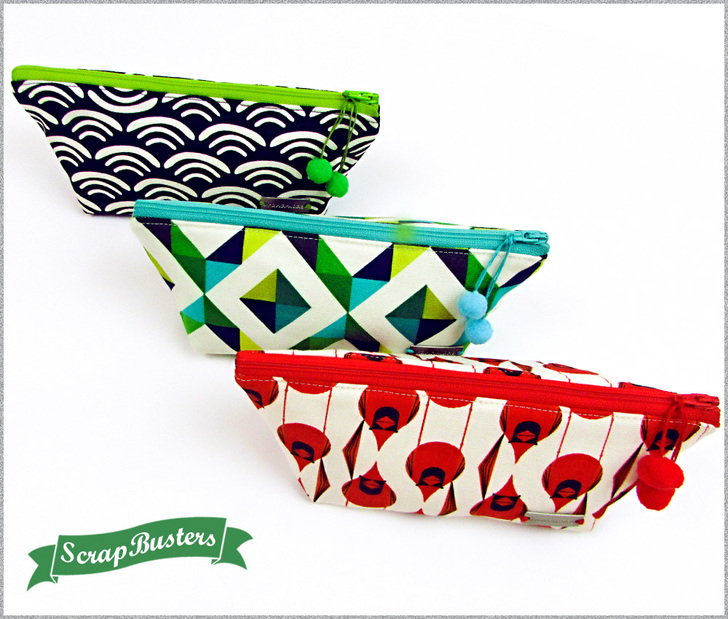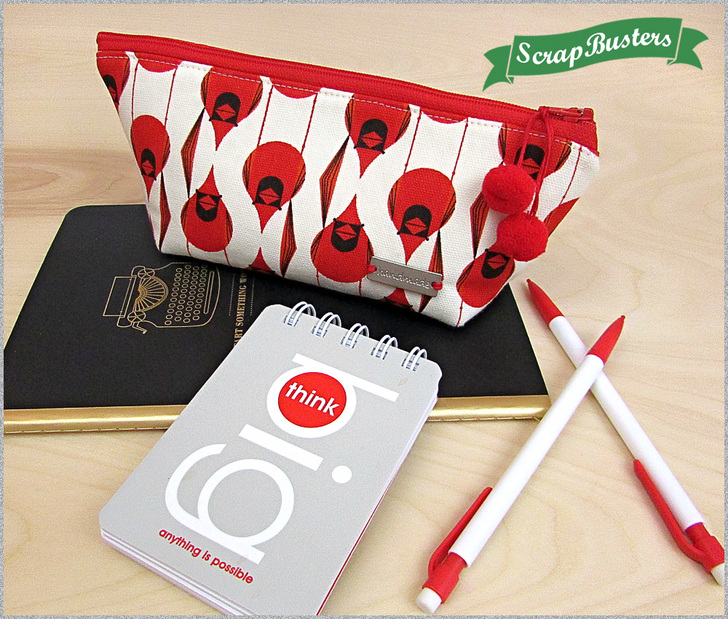 Look for a bright print in a smaller motif you can center on each of the panels so your case looks great from all sides within the triangle format. Little projects are fun for fussy cutting practice. You can then choose a matching zipper as we did with our red case, or go for a coordinating accent color, as we did with the other two samples.