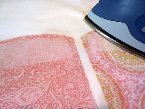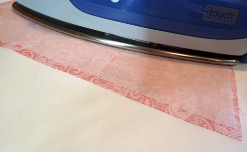 - Following manufacturer’s instructions, fuse the interfacing to the wrong side of each main case panel. Fuse one section at a time, starting with the top piece. Centering it on the panel so there is ¼” of fabric showing beyond the interfacing.