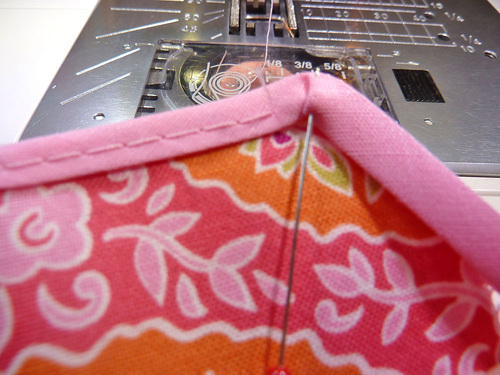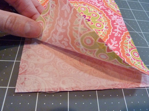 - Fold the corner on a diagonal and continue around to the next side. You can pick out some stitches from the previous side if need be to get a smooth pivot at the corner.