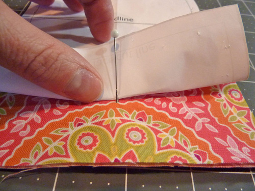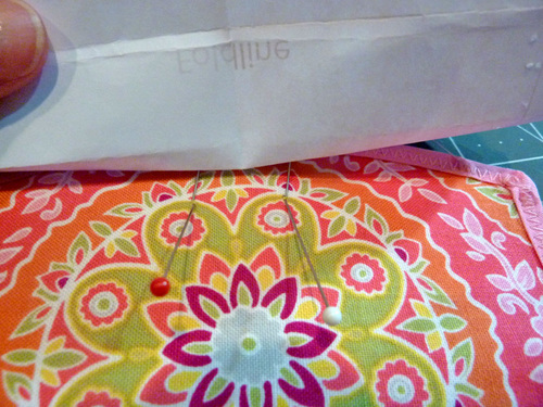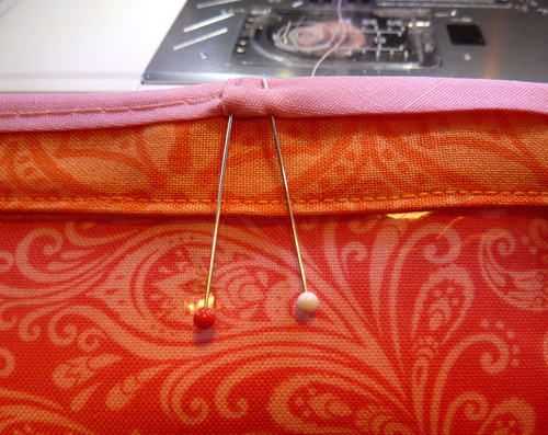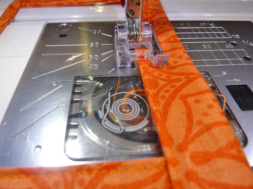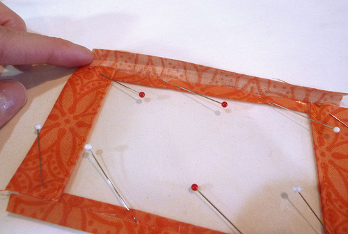- Starting at the center bottom of the panel, slip the double fold bias binding over the raw edge. Pin in place.