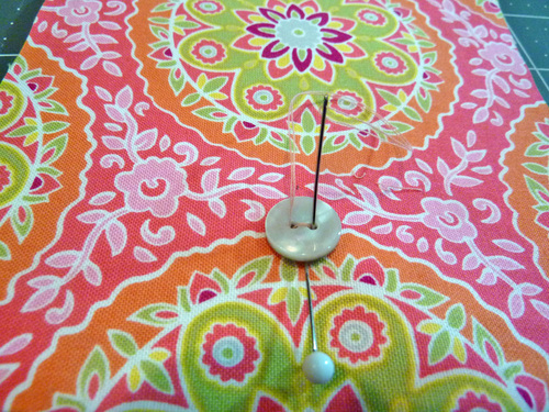 - Thread a hand sewing needle with thread to match the INTERIOR fabric and neatly hand stitch the button in place through both panels.