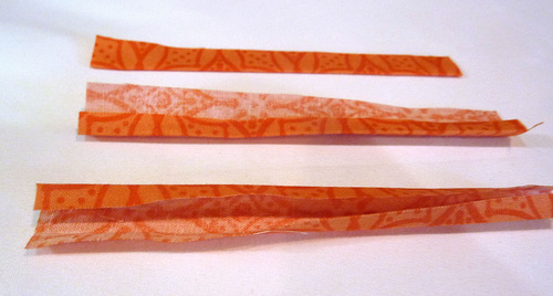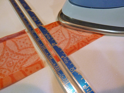 - On the three 1″ x 5″ top/bottom strips, press each in half lengthwise to set a center crease (so they would be ½” x 5″). Open the strip wrong side up so the crease line is visible. Press in each long raw edge so the two meet at the center crease line. Then, refold along the original fold line to create three small strips of ¼” double fold binding.