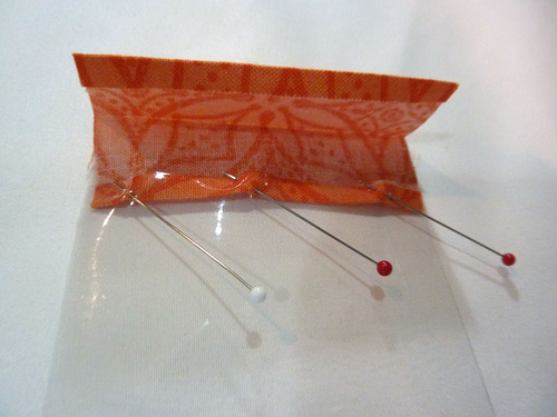 - Find one vinyl rectangle. Bind the sides first. To do this, open up a side strip and place the side edge of the vinyl rectangle along one folded edge of the strip. The raw edge of the vinyl should be flush with the folded in raw edge of the strip. Pin in place through the vinyl, just catching the fabric enough to hold the vinyl steady.