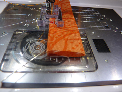 - Thread the machine with thread to match the fabric in the top and bobbin. Lengthen your stitch slightly.