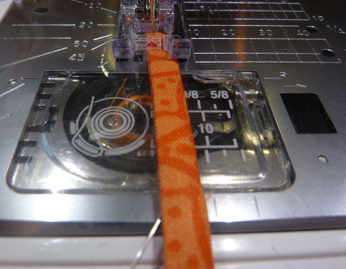 - Re-thread the machine with thread to match the binding in the top and bobbin. Set up the machine for a long basting stitch.