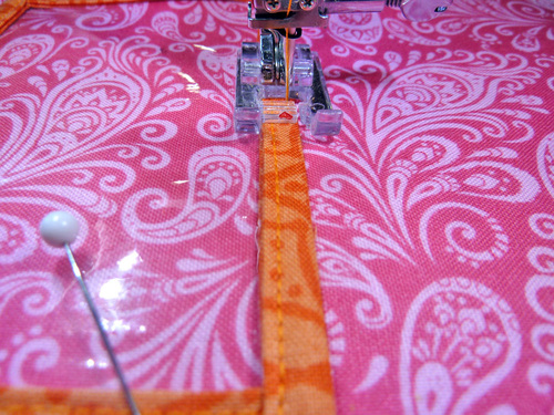 - Edgestitch the fabric strip to the vinyl, staying as close as you possibly can to the edges of the fabric. Remove the pins as you go along.