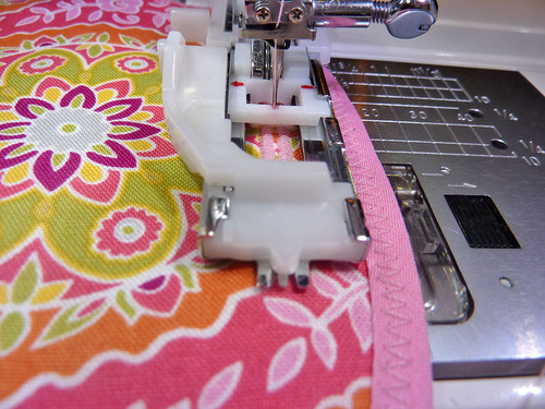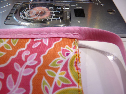 - When the bias binding is completely in place, go back around the entire perimeter with a zig zag stitch. This insures the narrow binding is truly secure. The binding secures the sides of both pockets and the bottom of the lower pocket.