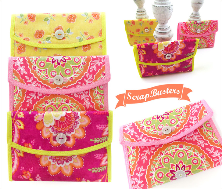 These cute little cases are an awesome option for scraps or leftover layer cakes and fat quarters, but the design also works well with small yardages when you set up for an assembly line of multiple cases. That way, you can mix and match between the cases, using leftovers from one for the inside pocket frames on another – making the most of the packaged binding.