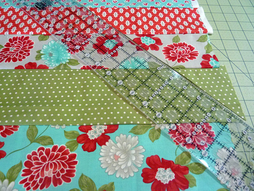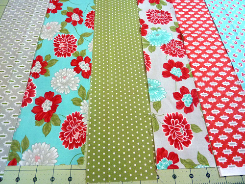 ONE 2½” width - Lay out your strips side by side until you have a color and pattern blend that strikes your fancy. Alternate patterns and colors to keep things interesting. The widths should be mixed randomly as well.