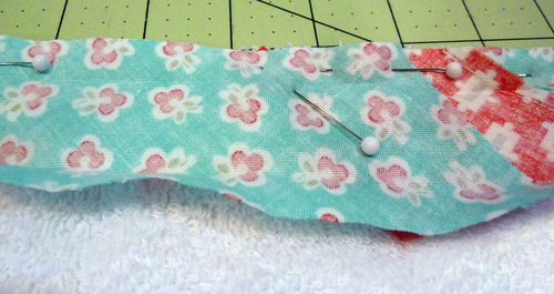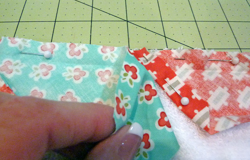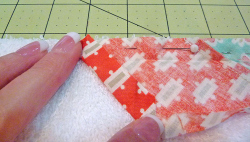 - Continue to pin around the washcloth until you come back around to the beginning. Ease around the corners to maintain a smooth fit. You can clip into the raw edge of the binding just a bit to help it curve.