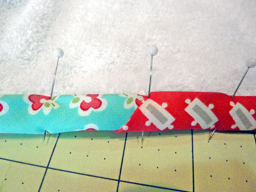 NOTE: A rotary cutter is really best for this project, but if you don’t have one, you can use your ruler to draw lines across the panel at the 2″ width and 45˚ angle, then cut along the drawn lines with standard scissors. - Stitch together the strips of bias binding end to end to make one continuous length. As with all bias strips your are assembling for binding, you will criss-cross the angled ends of the strips and pin in place.