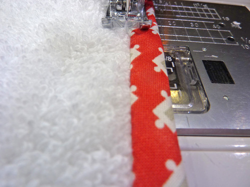 - Leaving about a 1″ tail at the beginning, line up the raw edge of the bias tape with the raw edge of the terry cloth square. Your bias tape and your fabric should be right sides together. At the head of the bias tape, fold back the angled end ½” and pin in place.