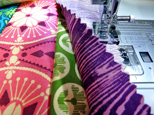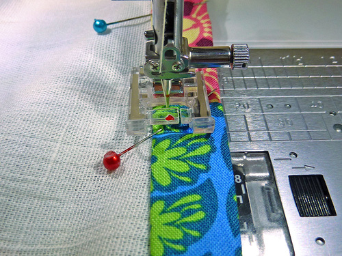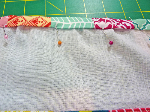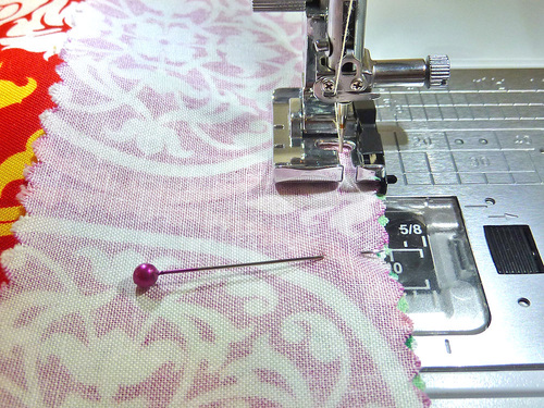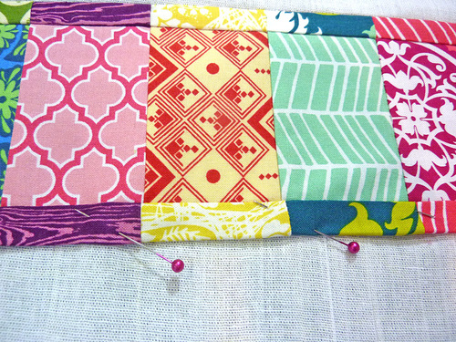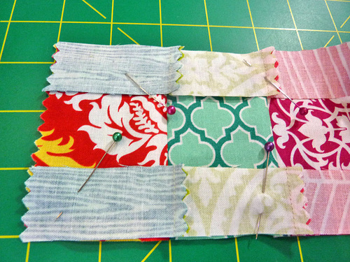 - Working in order (we worked from right to left), pin the first two strips right sides together along one long edge.