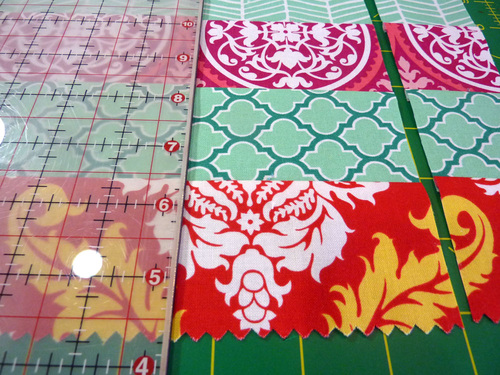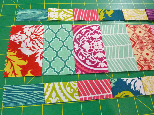 - Take the completed patchwork panel to your cutting surface. For each towel you need TWO 1” strips, ONE 3½” strip, and ONE 2” strip.