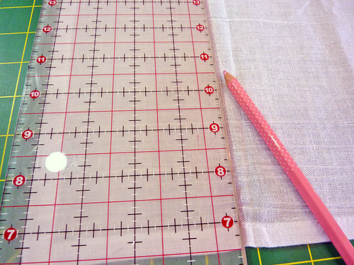 - Along the bottom of the towel measure and mark a horizontal line 4” up from the bottom hem of the towel.