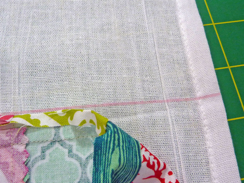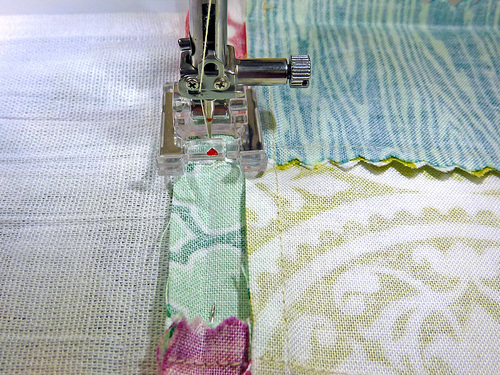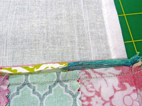 - Re-thread the machine if necessary with thread to best match the patchworked fabrics in the top and to best match the towel in the bobbin (with so many colors in our patchwork, we used white in both the top and bobbin). Lengthen the stitch. Edgestitch around all four sides, securing the ends and the top and adding an accent line of matching edgestitching to the bottom seam.