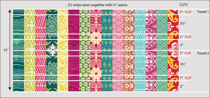 NOTE: Our design uses 15 coordinating fabrics for EACH towel. You could use fewer fabrics by repeating some within the pattern, but you don’t need more than 15 unless you have an unusually wide towel. As mentioned above, we used jelly roll strips to make the assembly quick and easy. If you don’t have any jelly roll strips, you can cut 2½” strips from your favorite fabrics. You need a minimum of 7½” in height for each towel, but it’s best to start with a minimum of about 10” in order to give yourself enough height to center motifs for a pretty fussy cut.