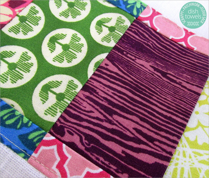 If one of your goals is to do a better job using up the fabric you have on hand, this project is right up your alley. We collected a few leftover jelly roll strips from two FreeSpirit True Colors collections: some from Anna Maria Horner’s set and some from Joel Dewberry’s set, proving you can move out of your comfort zone to mix and match across collections and designers! We show you how to make a patchwork panel from which you’ll sub-cut horizontal accent bands to jazz up a store-bought flour sack towel (or two or three).
